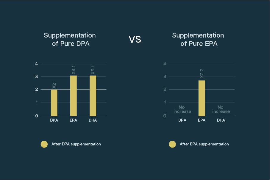 Une précédente étude réalisée par Kaur et coll. (2009) Kaur G, Cameron-Smith D, Garg M, Sinclair AJ. Docosapentaenoic acid (22:5n-3): a review of its biological effects. Prog Lipid Res. 2011 Jan;50(1):28-34. doi: 10.1016/j.plipres.2010.07.004. Epub 2010 Jul 23. PMID: 20655949. https://pubmed.ncbi.nlm.nih.gov/20655949/ a démontré que la supplémentation en DPA augmentait de manière significative les concentrations de DPA dans tous les tissus. Cela a également permis d’augmenter considérablement la concentration de DHA dans le foie et la concentration d’EPA dans le foie, le cœur et les muscles squelettiques.
