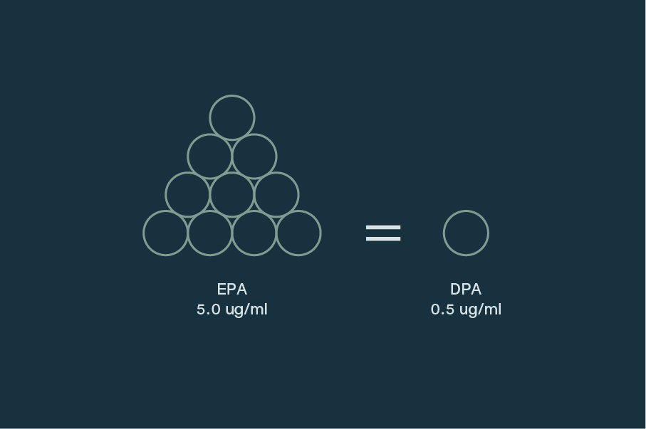 Un essai clinique intéressant consistait à administrer des doses de DPA concentré à un certain nombre de personnes. L’étude a démontré que, même après une brève supplémentation en DPA, les taux d’EPA, de DHA et de DPA présents dans le sang étaient tous plus élevés. Elle a aussi révélé que, contrairement au DPA, une supplémentation en EPA n’engendre qu’une augmentation des proportions d’EPA dans l’organisme. Cela indique que le DPA fait office de « réserve », pour permettre à ce dernier de stocker et d’accéder à ces oméga-3 essentiels en cas de besoin. Cette caractéristique permet d’optimiser l’absorption et l’utilisation de ces oméga-3.Miller E, Kaur G, Larsen A, Loh SP, Linderborg K, Weisinger HS, Turchini GM, Cameron-Smith D, Sinclair AJ. A short-term n-3 DPA supplementation study in humans. Eur J Nutr. 2013 Apr;52(3):895-904. doi: 10.1007/s00394-012-0396-3. Epub 2012 Jun 23. PMID: 22729967.