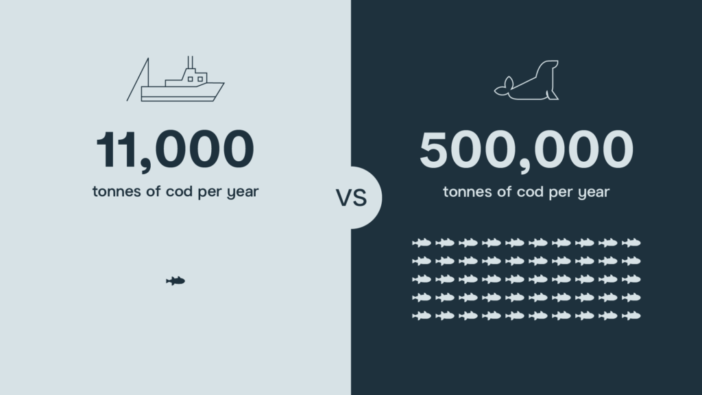 ᐆᒪᔪᕐᑕᐅᔪᓐᓇᕐᑐᓕᒫᑦ ᐅᒪᔪᕐᑕᐅᓐᓂᒃᐸᑕ, ᑖᒃᑯᐊ ᑮᓇᐅᔭᑦ ᑲᓇᑕᒥ, CAD$3.12 ᐱᓕᐊᓪᓗᐊᑦ. The annual quota is 400,0000 for harp seals. It is estimated that seals eat over 1.5 tons of fish per year. The value per tons of fish was at $5,200 in 2018. Source 400,000 seals x 1.5 tons x $5,200 = $CAD 3.12 BILLION.