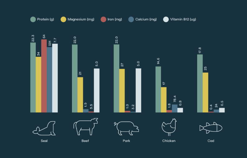 바다표범 고기는 캐나다 “슈퍼푸드”로 간주되며 지구상에서 가장 영양가가 높은 고기 중 하나입니다. 바다표범고기는 에너지를 증가하고, 근육을 강화하고, 면역 체계를 강화하고, 신체 조직을 복구하고, 적혈구 형성을 촉진하는 것으로 입증되었습니다.