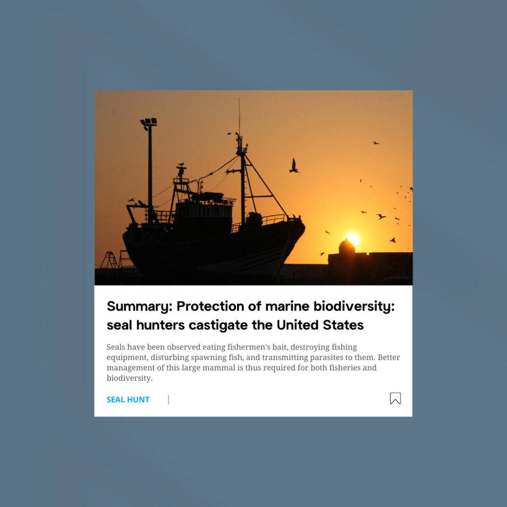 魁北克省海豹猎人协会(ACPIQ)谴责美国禁止使用海豹内脏作为贝类捕捞的替代饵料的意图。自去年以来,海豹内脏一直在替代着鲭鱼和青鱼来做诱饵,因为这两种鱼类已经处于禁捕状态。